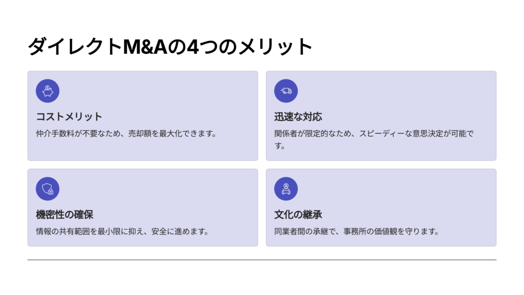 - コスト最適化:仲介手数料が発生せず、譲渡対価を最大化/買い手交渉も一本化。