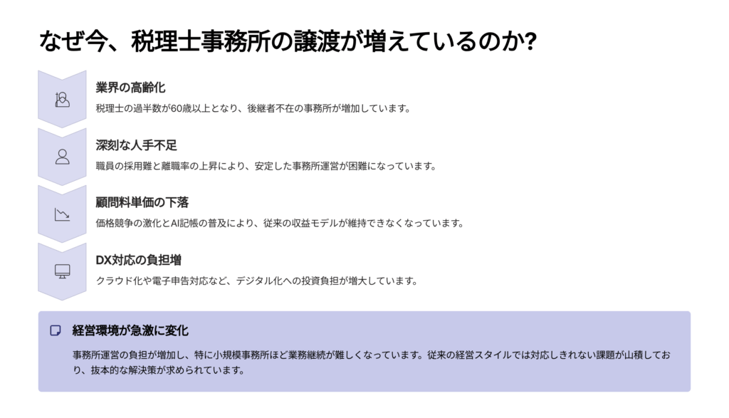 所長の高齢化と、承継意欲を持つ後継者の不在は、事務所譲渡の最も多い理由です。特に個人開業の税理士事務所では、 子どもや所内の職員が資格を持たず、事業承継が難しいケースが増えています。 これまで支えてきた顧問先との信頼関係を絶やしたくない、長年一緒に働いてきたスタッフの雇用を守りたい── そうした「想いを次につなぐ手段」として譲渡を選ばれる先生が少なくありません。2. 人手不足・業務負担の限界